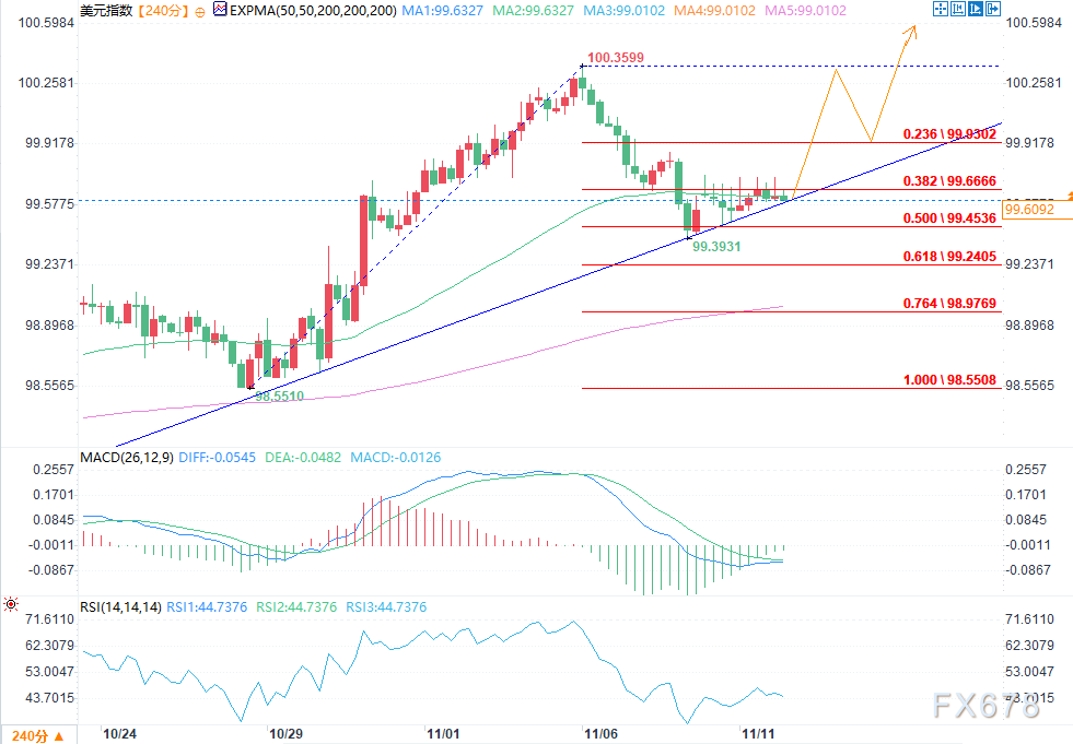 美元指数(DXY)从99.25支撑区间反弹后,在99.67附近盘整,维持短期看涨倾向。4小时图显示,价格走势遵循上升趋势线,多头捍卫更高低点。