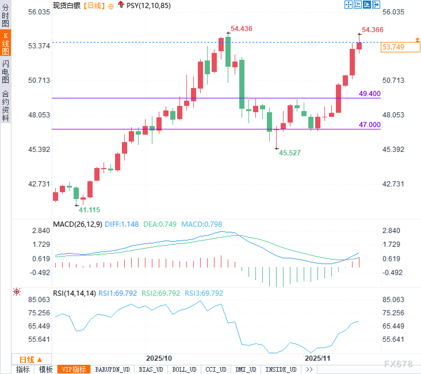日线图显示,现货白银目前整体维持在上升趋势通道之中。从41.115美元的阶段性低点起步,白银价格经历了一波强劲的多头行情,期间虽然出现过一次深度回调至45.527美元附近,但很快便重新恢复了上涨动能。这种V型反转的走势表明市场买盘力量充沛,每次回调都吸引了逢低买入的资金。当前价格距离10月创下的54.436美元和54.366美元双重高点仅咫尺之遥,这一区域构成了短期内的关键阻力位。若能有效突破54.50美元一线,白银有望向55美元甚至更高的整数关口发起冲击。