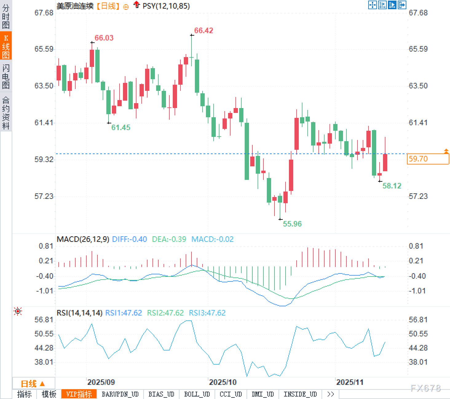从日线图的整体结构来看,美原油自66.42美元的阶段性高点展开了一轮幅度可观的下降趋势。价格行为清晰地勾勒出空头主导的市场格局,连续的阴线实体配合持续走低的高点和低点,构建了典型的下降通道形态。这一波段性回调在触及55.96美元的低点后暂时企稳,随后展开了一轮修复性反弹,目前交投于60美元附近。