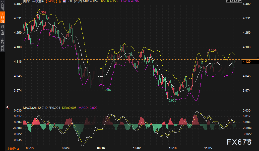 240分钟周期内,10年期美债收益率布林带中轨4.124%,上轨4.153%,下轨4.096%,当前价格位于中轨上方。MACD的DIFF与DEA均小幅转正(0.004与0.005),快慢线即将形成金叉,显示短期上行动能仍在。结合曲线陡峭化结构,未来2-3日10年期收益率可能在4.10%-4.18%区间继续上探,关键看是否突破4.153%布林上轨。若突破,可能快速指向4.20%附近;若受阻回落,4.096%-4.10%将成为第一道支撑。