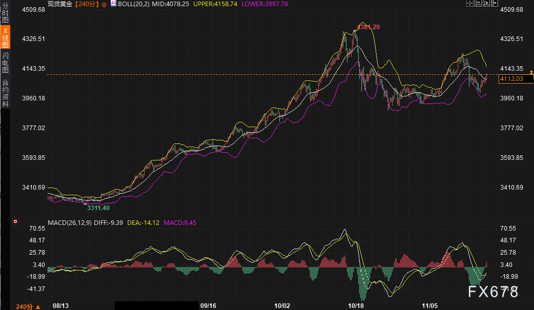 现货黄金240分钟图上,价格突破布林带中轨4078.28,并逼近上轨4158.82,日内涨幅一度超1.1%。MACD虽仍处于死叉状态(DIFF -9.36,DEA -14.11),但快慢线差距收窄,绿柱缩短,显示下行动能减弱,短期转势信号初现。