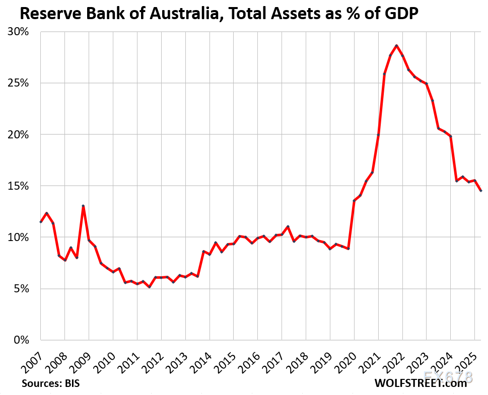 加拿大、澳大利亚“市场化程度最高”:两国比值(加拿大7%、澳大利亚14%)处于低位,接近2008年危机前水平,说明其央行已彻底退出大规模量化宽松,政策回归传统框架——两国经济依赖资源出口、房地产等市场化领域,央行干预较少,紧缩周期推进最彻底,流动性环境更接近“自然状态”。