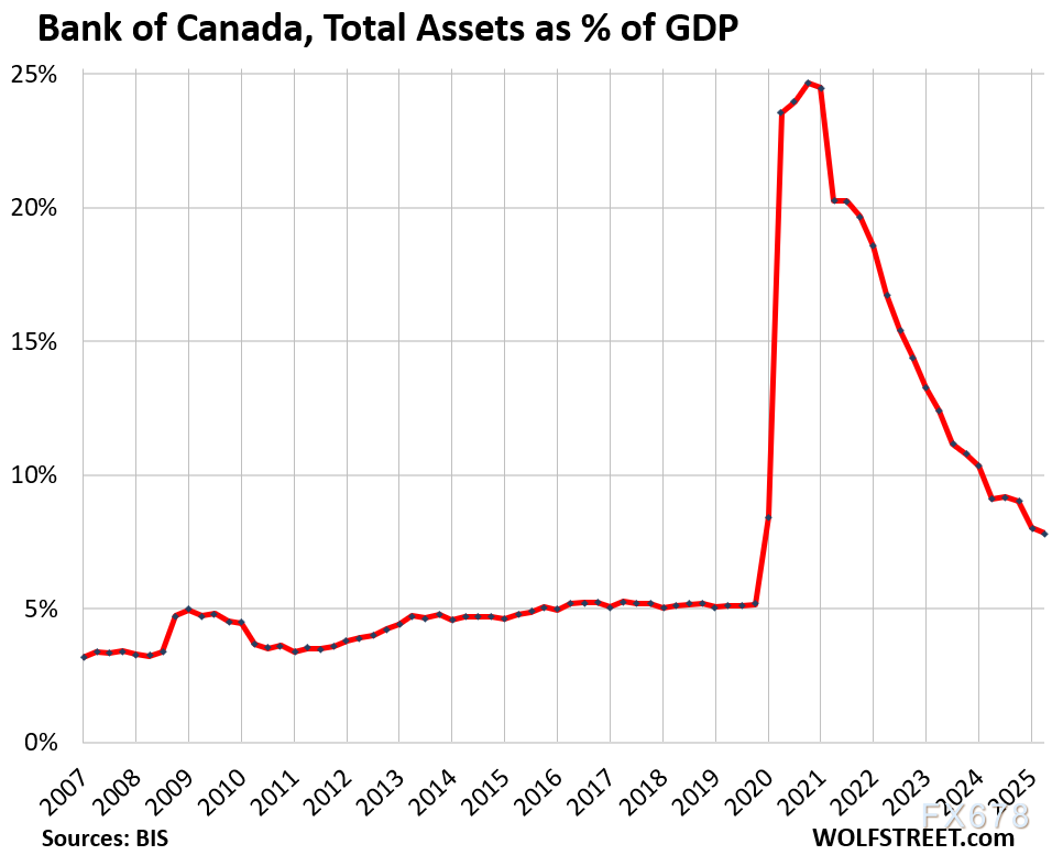 该行在相对低位终止QE后,随即启动快速缩表进程。据国际清算银行今日数据,加拿大央行资产/GDP比例目前已降至7.8%,回归至2008年之前的美联储水平。