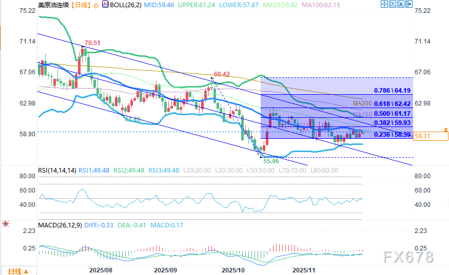 下行方面,若油价回落,将考验23.6%回撤位58.39美元。买家需在该位置主动进场以维持当前上行格局;若买盘不足,油价可能进一步下探近期摆动低点57.10美元(价值型买家此前介入的关键区域)。