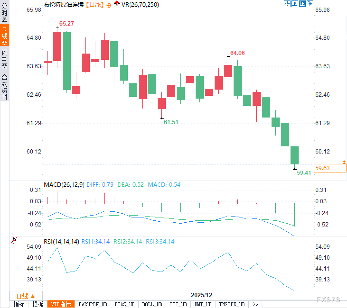 汇通财经APP讯——周二(12月16日),布伦特原油延续近两周的单边下行,盘中跌破60美元关口并刷新阶段低点59.41美元,美市盘前报价59.63美元。价格跌至七个多月低位附近,同时美国原油期货也回落到2021年2月以来的弱势区间,显示此次抛压并非局部情绪,而是整个原油复合体在同步下修定价。